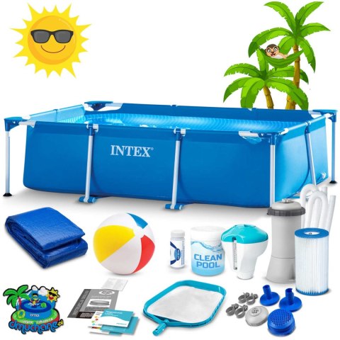 Wygodny basen ogrodowy stelażowy 220 x 150 x 60 cm zestaw 15w1 INTEX